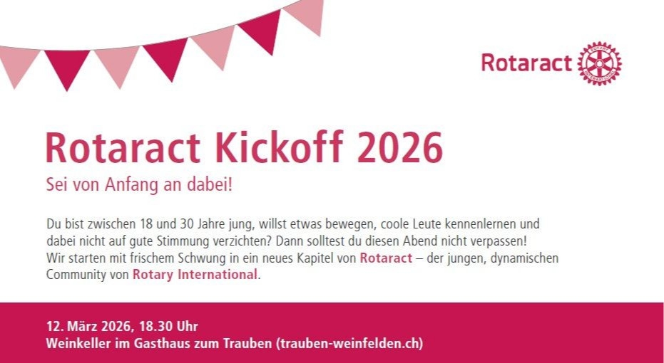 Du bist zwischen 18 und 30 Jahre alt, neugierig auf neue Menschen, Ideen und Engagement? Dann ist dieser Abend genau richtig für dich. Lerne Rotaract kennen, erfahre mehr über Projekte, Freundschaft und internationale Netzwerke und entdecke, wie einfach es sein kann, gemeinsam etwas zu bewegen.